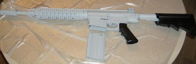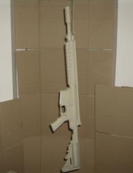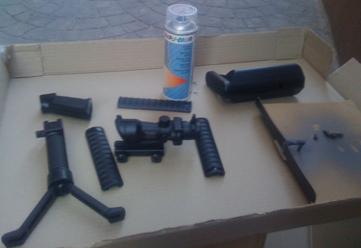 Am aplicat cate doua straturi de grund, problematic a fost grundul auto, fiind foarte volatil. Trebuie aplicat in straturi foarte fine, cu foarte mare atentie. Mie mi-a curs pe alocuri, fiind necesara retusarea ulterioara cu smirghel fin (de 1000). Am lasat sa se usuce 24 de ore, dupa care am retusat ce era de retusat, am asamblat totul; pistol grip-ul si stock pipe-ul le-am atasat cu ajutorul unor cartoane si banda dublu-adeziva, avand in vedere faptul ca gearbox-ul lipseste din replica (Figura 3).