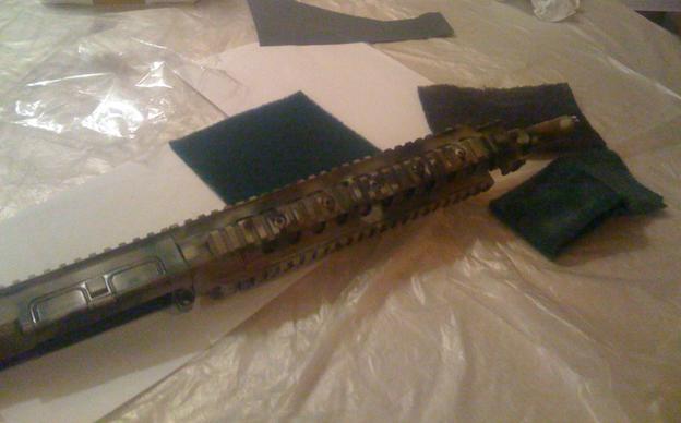 Primul lucru a fost sa dezasamblez replica si sa scot absolut totul din ea (gearbox, teava, motorcontroale). Dupa care am spalat totul cu pur universal, am lasat sa se usuce bine si am degresat totul cu diluant. Am reasamblat partile metalice (upper si lower receiver) folosind pinii de prindere si niste banda dublu-adeziva (gearbox-ul nu era inauntru). Dispozitivul optic l-am protejat cu ajutorul unei benzi adezive, speciale pentru mascat.