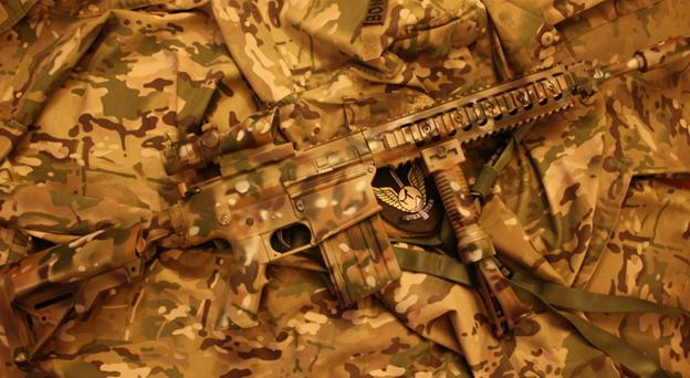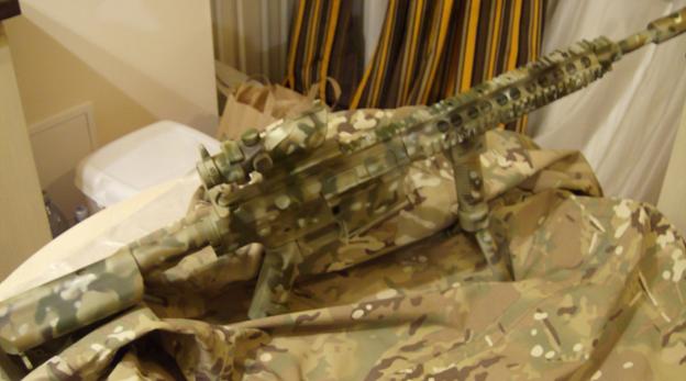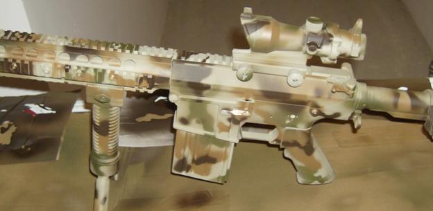 Nu am reusit sa fac rost de culorile care compun schema de camuflaj MULTICAM, insa aveam ceva apropiat. M-am inspirat si dintr-un ghid pe care l-am gasit pe forumul de AR 15, unde este explicat ce anume trebuie sa faci sa obtii tonuri apropiate.