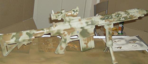Cu toate ca nu am reusit sa replic perfect MULTICAM-ul, replica iesind in final prea inchisa, per total sunt multumit de rezultat. De la cativa metri distanta si luminata direct cu lumina puternica, exista o mica diferenta sesizabila, de la aceeasi distanta fara lumina directa diferenta nu este sesizabila. Am invatat multe lucruri, urmatoarea imi va iesi cu siguranta mai bine, mi-am propus sa vopsesc si o replica mai mica (un SOPMOD sau un SCAR, nu m-am hotarat inca), de data aceasta am comandat setul de culori corect (zic eu), vom vedea ce va iesi.